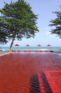 águas da piscina do The Library, na Tailândia, têm um tom diferente. O vermelho, que faz um contraste perfeito com o azul do céu, dá a cor ao local. Escolher entre a piscina e o mar de águas transparentes é uma árdua decisão Crédito: The Library