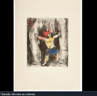 "Vilarejo com Cavalo Verde ou Visão sob a Lua Negra", de 1959O grande destaque da exposição são três séries completas de desenhos, produzidos a partir de diferentes técnicas e que chegam pela primeira vez ao País. "La Bible" ("A Bíblia"), na qual Chagall trabalhou entre 1931 e 1939, traz histórias do Velho Testamento, como a saída dos judeus do Egito e a construção da arca de Noé, e retratos de seus personagens mais marcantes, como os três patriarcas e os reis Salomão, David e Saul.