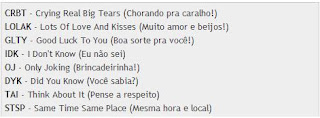 Você sabe o que significam as siglas em inglês: LOL, OMG, WTF, IMHO, FML, PYT, CRBT, etc? São gírias da Internet, em sua maioria abreviações de expressões comuns no dia-a-dia da vida real.Quando essas siglas estão em português conseguimos identificá-las com facilidade. Por exemplo, garanto que todo mundo sabe o significado da sigla FPD, usada na frase: Aquele cara é um grande FDP. O problema é quando essas siglas são importadas.É o tipo de coisa que depois que você descobre, pensa como é óbvio. Mas enquanto não sabe, parece um mistério impenetrável. Se você está com a pulga atrás da orelha, por causa de alguma gíria da Internet em inglês, que não consegue traduzir, seus problemas acabaram!No InternetSlang.com você pode pesquisar expressões como LOL, OMG, IMHO, FML, PYT, já citadas neste texto e muitas outras conforme você for as encontrando no seu caminho virtual do dia-a-dia. Veja alguns exemplos: