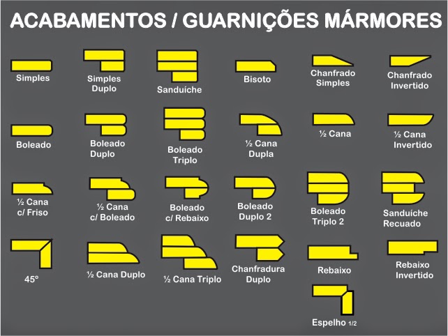 São os diversos modelos de acabamentos que são utilizados para trabalhar a borda das pedras, mais utilizados em pias, lavatórios, lavabo, mesas, aparadores, bancadas e etc.